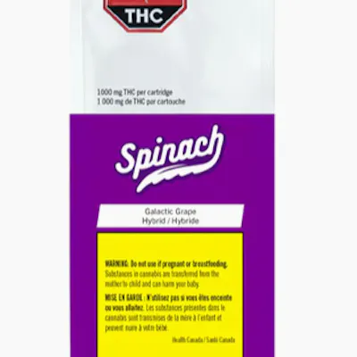 An interstellar journey of flavour begins with earthly elements from right off the vine. The Spinach Galactic Grape 1.2g Vape is gushing with sweet flavours that go to the ends of the universe and back with just one puff. Inspired by the Galactic Grape cultivar with Grape Diamonds and Stardawg lineage, it’s no surprise that this potent vape at 1000mg of THC per cart breaks barriers of flavours and aromas. Their rich CO2 extract is cold-filtered at sub-zero temps before it is distilled 4x to ensure consistency and to deliver consistent quality, time and time again.This vape has been formulated with distillate and all natural botanical terpene.