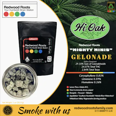 Gelonade by Hi Oak Farm is a sativa-dominant cultivar bred from Lemon Tree × Gelato #41, celebrated for its sharp citrus-forward profile and upbeat, functional effects. Known for bright lemon zest, peppery spice, and subtle sweetness, Gelonade is typically driven by limonene and caryophyllene, delivering an energetic, focused, and talkative high that’s great for daytime use, creativity, or social settings. The experience often starts with a clear cerebral lift before settling into a balanced, motivating groove without heavy sedation. Offered here as Redwood Roots Mighty Minis, these small buds pack full terpene expression and potency, cultivated in Southern Humboldt’s Whitethorn Valley within the Mattole River watershed, using regenerative farming practices that honor legacy terroir.