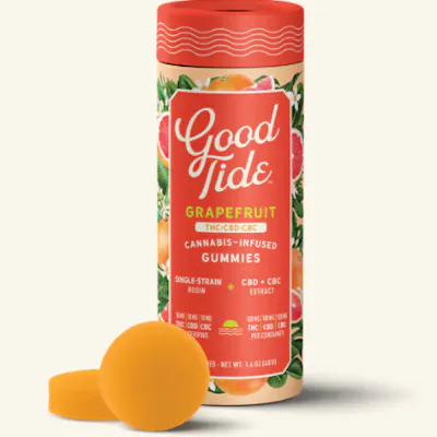 Good Tide Grapefruit THC:CBD:CBC gummies pair a Sativa single-strain rosin with the mood-boosting effects of CBC for citrusy, decadent treat that will get you a front row seat to bliss.? 10mg THC:CBD:CBC per gummy, 100mg THC:CBD:CBC per container.