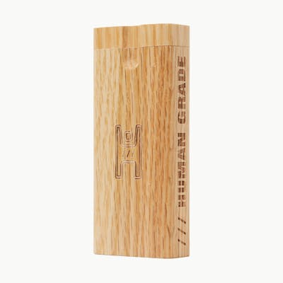 Introducing Human Grade wooden dugouts, crafted with both elegance and functionality in mind. Our dugout features a cleverly integrated magnetic internal poker storage, keeping your poker discreetly concealed yet readily accessible. The main compartment is dedicated to your favorite smoking blends, offering ample space to store and preserve their freshness. This dugout is compatible with all standard one-hitters, making it a versatile choice for any enthusiast. Each dugout comes complete with a matching Taster Bat, perfectly complementing the overall aesthetic and usability. Expertly designed and aesthetically pleasing, this wooden dugout is the ideal companion for both everyday use and special occasions, providing convenience, style, and a touch of sophistication to smoking rituals. Retail Unit: One (1) Dugout. Each dugout includes a metal poker and an aluminum One Hitter. Size: 4" x 1.75" x 0.75" Packaging Size: 4.125" x 1.75" x 0.75" Milled Natural Wood Aluminum Spring Loaded One Hitter Deep Trough for Ground Material Storage Swivel Top for Easy Use On The Go or At Home Metal Poker Included