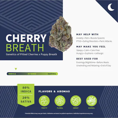 Genetics of Pitted Cherries x Puppy Breath Indica Dominant Hybrid- 80% Indica/ 20% Sativa Flavors & Aromas: Fruity, Floral, Sweet, Herbal Effects: Sleepy, Calm, Care-Free, Hungry, Euphoric, Lethargic May Help You With: Anxiety, Pain, Muscle Spasms, Eating Disorders, Panic Attacks, PTSD. Best Used For: Evenings/Nighttime, Before Meals, Unwinding and Relaxing, End of Day.