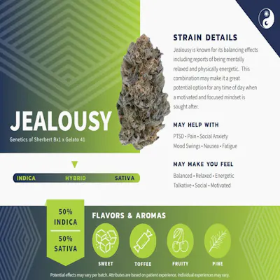 Jealousy is known for its balancing effects including reports of being mentally relaxed and physically energetic. This combination may make it a great potential option for any time of day when a motivated and focused mindset is sought after. - Sherbert Bx1 x Gelato 41 - Hybrid Dominant - 50% Sativa/ 50% Indica - Flavors & Aromas: Sweet, Toffee, Fruity, Pine - Effects: Balanced, Relaxed, Energetic Talkative, Social, Motivated - May Help You With: PTSD, Pain, Social Anxiety, Mood Swings, Nausea, Fatigue -- Contains Five .5g Pre rolls