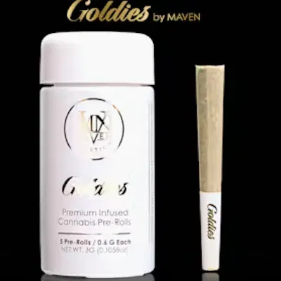 BluZangria is a vibrant Sativa that fuses two Maven favorites into one remarkable cultivar. Born from the award-winning Sour Sangria and the fan-favorite Blueberry ZKZ, this strain carries the dense, colorful structure of its Sangria lineage with vivid violet and sapphire hues, dusted in glistening Trichomes. Its aroma bursts with ripe blueberries, tangy citrus, and subtle floral spice, translating into a smooth smoke layered with sweet, sour, and zesty notes. The effects are bright and energizing, sparking creativity and focus while uplifting the mood with a refreshing, long-lasting cerebral buzz, now elevated in Goldies form. Each Goldies Infused Pre-Roll 5-Pack contains five 0.6g joints made exclusively from BluZangria, ensuring a smooth, strain-authentic infusion with elevated potency. Pure infusion. Pure power. Pure BluZangria. Goldies are Maven’s premium infused cannabis pre-rolls — crafted for connoisseurs who demand purity, potency, and authenticity. Each Goldies Infused Pre-Roll 5-pack contains five 0.6g joints made exclusively from our award-winning indoor flower, ultra-refined cannabis oil, and strain-specific kief. Every element is 100% cannabis-derived, strain-specific, and terpene-rich — designed to deliver a clean, powerful, and flavorful smoke. Unlike other infused pre-rolls on the market, Goldies never include artificial terpenes, botanical additives, or cutting agents. Just premium indoor flower, meticulously paired with potent oil, terpene, and kief from the same strain, blended in perfect ratios to elevate the smoking experience. BluZangria Goldies encapsulate the very best of Sour Sangria and Blueberry ZKZ, refined into a bold, flavorful expression - the result is a sophisticated infusion — smooth, aromatic, and undeniably powerful — made for those who expect more from cannabis.