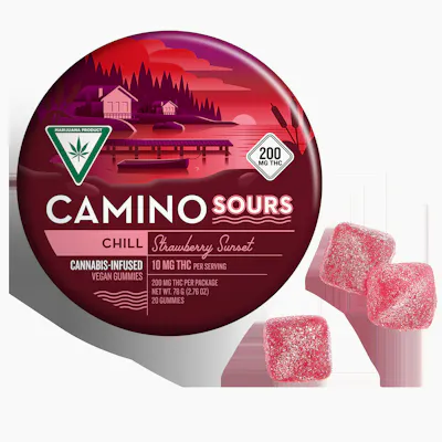 "Kick back dockside and relax to the rhythmic sounds of soft waves lapping against the shoreline. Indica-like terpenes meet a refreshing strawberry citrus flavor in this marvelously mellow edible. Take a deep breath in and chill out." -Camino