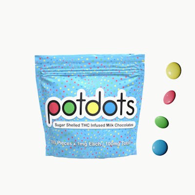 "Potpots are 1mg THC infused candy-coated milk chocolate pieces that are crafted from gourmet Belgium chocolate. Microdosable, snackable, shareable. Each package contains 100 individual 1mg THC pieces. 100mg THC Total. Shelf life of 9 months from production date." -Dream Edibles