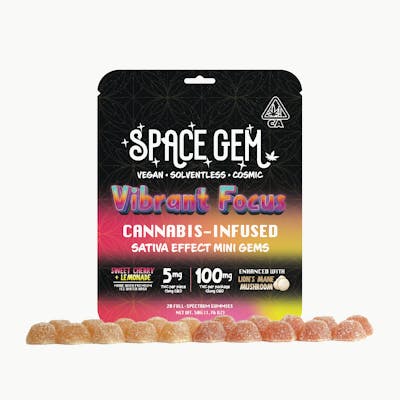 Awaken your mind with Vibrant Focus, Space Gem’s Sativa-inspired functional gummy crafted with organic ingredients and solventless ice water hash. Infused with Lion’s Mane mushroom for enhanced focus and creativity, these Sweet Cherry & Lemonade gummies deliver a bright, uplifting high that fuels productivity, positivity, and flow. Each piece contains 5mg THC for a smooth, energetic experience — perfect for daytime adventures, brainstorming sessions, or elevating your morning ritual.