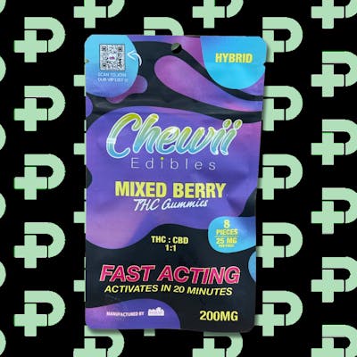 Chewii 200mg Gummies - Mixed Berry 1:1 (HYBRID) THC : CBD 1:1 Indulge in Chewii Edibles’ delicious and potent cannabis-infused gummies, expertly crafted with top-quality ingredients, lab-tested for consistent potency and quality, and available in a range of mouthwatering flavors.