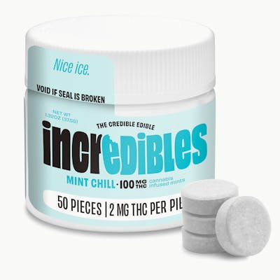 Fresh breath, cooling mint, and a blast of “heck yeah” confidence. It’s go time. incredibles Mint Chill mints offer 100mg THC total, with 2mg THC per mint. Made with pure THC distillate in a homogeneous mixture to ensure accurate dosing and consistency.