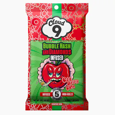 Cloud 9 Classic Mini-Rolls are a 5 pack of 0.6g diamond and terp infused flower crowned with solventless bubble hash extracted onsite at Exhale Systems. Total weight is 3g per package, and comes in a metal, child-safe tin. Red Apple Rush Crisp red apple meets light spice. Euphoric head high with a smooth finish that gives you that mental snap and bright energy, like a cold bite of apple at sunrise. Flavor Profile: Juicy Red Apple · Sweet Effects: Creative · Energetic · Focused Primary Terpenes: Limonene, ß-Caryophyllene, Myrcene