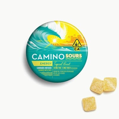With Camino Sours Tropical Burst Energy gummies, you can enjoy an exhilarating experience with 10MG THC and 5MG THCV plus the vitamins B6 and B12, sativa-like terpenes, and caffeine. THCV is your energy-boosting ally, potentially enhancing metabolism and curbing appetite. It ensures a clear-headed journey ahead. B6 is a prominent player in the body’s energy-production process to give your body the fuel it needs for physical activity, while B12 helps keep your body’s blood and nerve cells happy. Caffeine, the beloved stimulant, is known for its mood-improving properties that provide increased alertness and reduce fatigue. Each gummy contains the caffeine of half a cup of iced tea. -- There’s a Camino for every taste, tolerance, and occasion. With a variety of terpene-tailored effects and delicious fruit flavors, we invite you to explore our family of Camino edibles. We know you’ll… find your sweet spot. -- Terpenes: SATIVA-LIKE TERPENES: LIMONENE, ALPHA-PINENE, BETACARYOPHYLLENE, VALENCENE 10mg THC and 5mg THCV per piece | 100mg THC and 50mg THCV total in 10 pieces