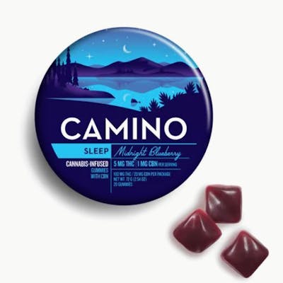Our top selling product - and for a reason. Settle in for a smooth slumber by a serene lake and let all your worries go. This calming combination of THC, CBN, and relaxing, indica-like terpenes pair with chamomile and lavender extracts to promote restful sleep. -- There’s a Camino for every taste, tolerance, and occasion. With a variety of terpene-tailored effects and delicious fruit flavors, we invite you to explore our family of Camino edibles. We know you’ll… find your sweet spot. -- INGREDIENTS: Organic Tapioca Syrup, Sugar, Gelatin, Malic Acid, Natural Flavors, Citric Acid, Cannabis Extract, Fruit and Vegetable Juice for Color, Chamomile Extract, Lavender Extract, Natural Terpenes, Coconut Oil, Carnauba Wax 5mg THC & 1mg CBN per piece | 100mg THC & 20mg CBN total in 20 pieces