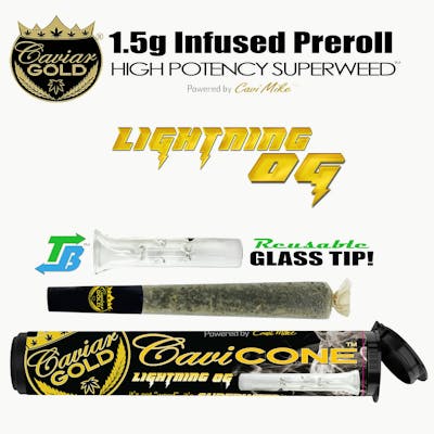 The Lightning OG 1.5g Cavi Cone by Caviar Gold is not a standard joint—it’s a high-potency "infusion" designed for extreme strength. Caviar Gold is famous for their patented process of infusing 98% pure liquid THC into the flower, rather than just dusting it on the outside. The "Lightning OG" is their signature heavy-hitting Sativa-dominant infusion, built for maximum energy and a long-lasting high.