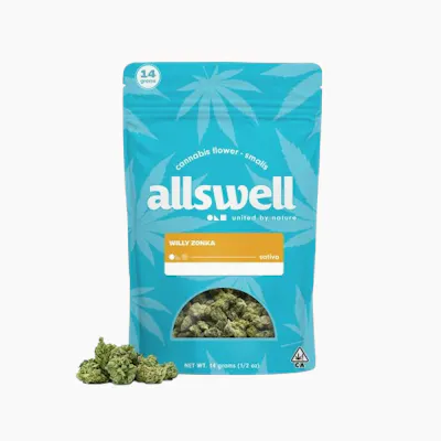 The Willy Zonka Smalls (14g) by Allswell is a "lively and intellectually stimulating" sativa designed for those who seek a high-value, bulk-buy option for daytime productivity and social energy. This half-ounce bag features "smalls"—compact, popcorn-sized buds that retain the same resin density and potency as top-shelf flower, typically testing between 25% and 27% THC. True to its whimsical name, it delivers a "bright and candy-like" aromatic profile defined by sweet citrus blossoms and tropical fruit, artfully finished with a subtle floral note that keeps every hit smooth and refreshing. Its effects are prized for being "cerebrally electrifying and physically light," providing a clean, energetic glow that sharpens focus, enhances mood, and sparks creativity without the heavy "come-down" associated with many hybrids, making it a premier choice for "daytime adventures," creative brainstorming sessions, or staying high-functioning through a busy schedule. With Allswell’s commitment to "bringing better feelings and calmer minds through high-quality greenhouse cultivation," the Willy Zonka Smalls offer a sophisticated and budget-friendly way to achieve a "steady, high-altitude mindset" while enjoying a flavorful, sun-drenched experience.