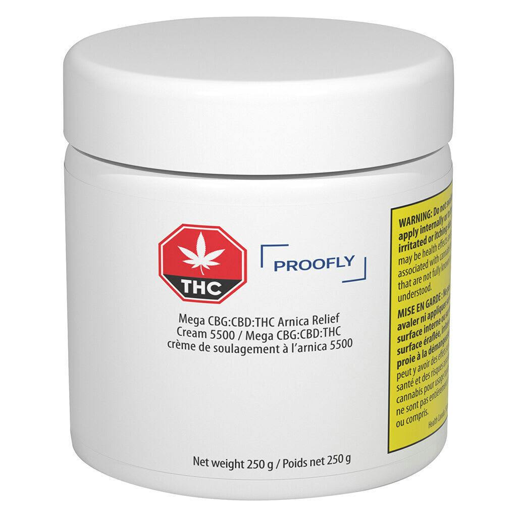 Mega CBG:CBD:THC Arnica Relief Cream 5500 features 2,500 mg of CBG, 2,500 mg of CBD, 500 mg of THC, all combined with potent ingredients including arnica, menthol and peppermint. It’s also packed with natural plant extracts such as jojoba oil, babassu oil and cocoa butter. Avoid broken skin and sensitive areas. For topical use only.