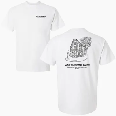 QHCB Store Sketch Tee — Heavyweight Clean, heavy, no shortcuts. Built on a premium 9 oz heavyweight blank, this tee is designed to hold its shape and wear in over time—not wear out. The oversized fit and dropped shoulders give it an easy, structured drape that feels substantial without being stiff. Finished with our Quality High Cannabis Boutique Store Sketch graphic featuring our iconic 114 year old building—an understated nod to the space that started it all. Part of the QHCB Elevated line: quality pieces, done right. When to reach for it: when you want something that feels as solid as it looks. Quick Facts Color: White Sizes: S–XXL Fabric: 9 oz heavyweight, 80/20 ring-spun cotton/polyester Fit: Oversized with rolled forward dropped shoulders Details: Wide 2"x 2" ribbed collar, taped neck & shoulders for comfort and durability Construction: Built for durability and long-term wear Materials: Made with Better Cotton to improve cotton farming globally Dyes: OEKO-TEX certified low-impact dyes