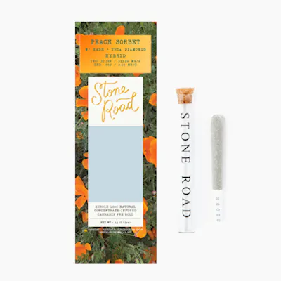 Stone Road – Infused Preroll (1.0g, Peach Sorbet – Hybrid) Peach Sorbet is a flavorful hybrid with a bright, refreshing aroma. Juicy peach notes take the lead, layered with a smooth, creamy sweetness and a touch of citrus zest. This balanced strain offers a mellow, uplifting experience suitable for any time of day. This 1.0g infused preroll is enhanced with premium hash and THCa diamonds, delivering increased potency and a smooth, flavorful smoke in a convenient, ready-to-enjoy format. THC: 37.32% CBD: 0.6%