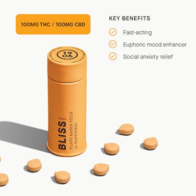 Bliss promotes extroverted happiness and euphoria through a blend of cannabis and two plant medicines. Swallowable pills with rapid onset of 20 minutes. Vegan, calorie-free, sugar-free, and gluten-free.