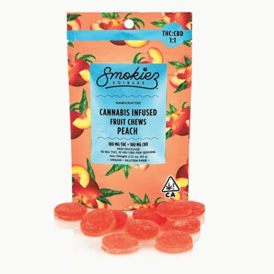 A harmonic blend of CBD and THC, Smokiez Peach CBD:THC 1:1 Fruit Chews are NOT YOUR AVERAGE FRUIT CHEWS™ ;) These delicious fruit chews are a tasty and discreet way for you to medicate! They are also Vegan, Gluten Free, Dairy-Free, and contain NO High Fructose Corn Syrup. Each of our mouth watering fruit chews contain 10 mg of CBD and 10 mg of THC, and made with our high clarity cannabis distillate for great taste. There is 10 pieces per package with 100mg CBD + 100 mg active THC per package.