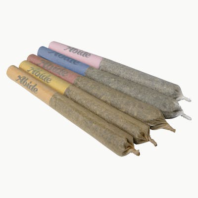 Sample Abide's full range of organically sun grown flower in a convenient pack. Each pack includes one each of: Pink Lemonade (indica, Pink Kush x Lemon Skunk), Blueberry Bliss (hybrid, Blue Gelato x MAC1), OG Haze (sativa), Lemon Sapphire (2:1, Lemon Skunk x Mango Sapphire) and Mango (1:1, Mango Sapphire x Mango Haze). These pre-rolls are bursting with favour with terpenes ranging from 3% to 4.6%.