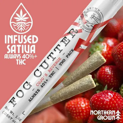 Cut through the haze with Fog Cutter Infused Pre-Rolls. Cujo's Revenge (Infused Sativa) A beast - bold, juicy, and ready to sink its teeth in. Featuring a blend of natural Strawberry-Watermelon & Coconut flavors with Live Terps from the Sativa-dominant Pink Panther strain, Cujo's Revenge smacks you with a ferocious wave of ripe strawberries and tropical coconut sweetness before settling into a scarily smooth finish. It's untamed, unforgettable, and just dangerous enough to keep you coming back for more. Packed with hydroponic cannabis, cultivated in a controlled, soil-free environment, ensuring unparalleled consistency, purity, and potency. Each Fog Cutter pre-roll is then infused with high-potency distillate extract and enhanced with a precise blend of natural and live terpenes, delivering bold flavors and amplified effects. What truly sets Fog Cutter apart isn’t just the exceptional quality - it’s that this level of craftsmanship is made accessible to everyone because premium cannabis should be enjoyed without the premium price tag. With THC levels starting at 40%, a centrifugal rolling process for perfect burns, and flavors inspired by the rugged beauty of New England, Fog Cutter is proof that you don’t have to overpay for a top-tier experience.