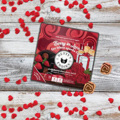 Roses are red, chocolate is sweet – Betty's swirled flavor and fun into a Valentine’s Day treat! These swoon-worthy strawberry-and-chocolate swirl chews are infused with full-spectrum cannabis and CBG. A decadent little treat designed to boost your mood and spark connection, they’re the perfect match for you and your Valentine. Or keep the whole bag for your one true love – yourself! Chews love, feel the spark!