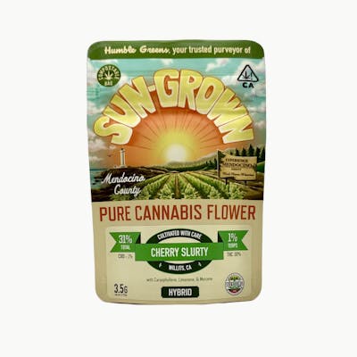 Cherry Slurty is a premium sungrown Hybrid flower cultivated by Sticky Fields Farms in Mendocino County. A flavorful cross of Cherry Pie x Durban Poison, this strain brings together sweet fruit character and classic sativa brightness. Aromas of ripe cherry, berry syrup, and subtle spice rise, layered with earthy notes and a hint of herbal citrus. The flavor is smooth and fruity with a lightly peppered finish. Expect a balanced high - uplifting and creative up front with a steady, grounded body feel. Sungrown under Northern California sun, this flower reflects Humble Greens’ commitment to terroir-driven craft cannabis.
