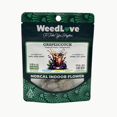 Grapescotch is a sweet Hybrid that tastes as good as it sounds. Bred by award winning Mercy Grown in Sonoma County, it's a mix of Grapes & Cream and Butterscotch. This strain delivers a decadent flavor profile of sweet grape, creamy vanilla, and a touch of caramelized funk. The aroma is dessert-worthy, and the smoke is smooth from start to finish. Effects land right in the middle - uplifted yet relaxed - real jazzy - making it an easy choice for day or night. With sticky buds, tasty terps, and all the charm, Grapescotch proves that WeedLove to take you higher while keeping it flavorful and fun!
