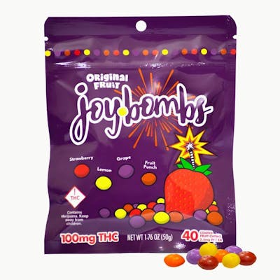 Savor a classic candy experience with Original Fruit Joy Bombs Candy-Coated Fruit Chews! Includes an explosive mix of delicious fruit flavors: Strawberry, Lemon, Grape & Fruit Punch! Joy Bombs’ signature sugary shell means they'll melt in your mind, but not in your car, purse, or pocket. They're perfect for easy snacking and sharing. Joy Bombs are purposefully dosed to help you dial in or stack the milligrams and effects that you want! With 2.5mg THC in each bite-sized piece, you can micro-dose for days or nom the whole pouch for a 100mg adventure! Dietary Info: Gluten Free & Vegan. Contains Soy.
