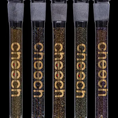 Cheech glass downstem featuring glitter-infused designs in multiple colors, crafted from durable heat-resistant glass to provide smooth airflow, enhanced filtration, and a bold, eye-catching cannabis smoking experience.