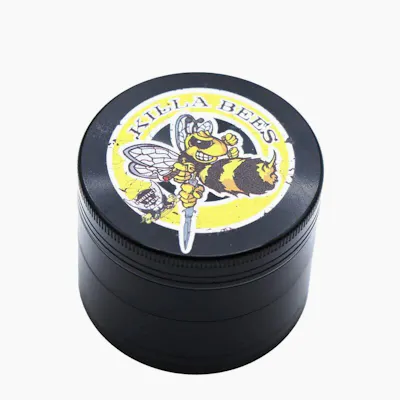 Killabeez premium metal herb grinder featuring a bold graphic lid design with durable multi-piece construction and sharp precision-cut teeth, engineered for smooth grinding, efficient herb processing, and consistent texture for an enhanced cannabis preparation experience.