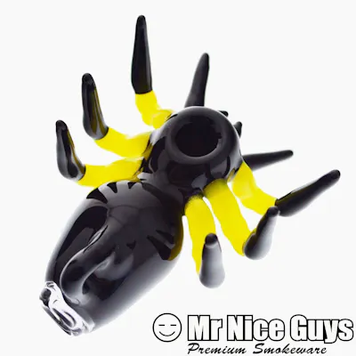 Mr. Nice Guys novelty silicone hand pipe featuring a bold spider-inspired design with striking black and yellow accents. Handcrafted from durable heat-resistant glass, it includes an integrated bowl and carb hole for controlled airflow, delivering smooth hits and a unique, eye-catching smoking experience.