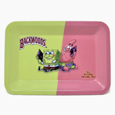 Backwoods metal rolling tray featuring a fun split-color design with cartoon character graphics. Crafted from durable metal with raised edges to contain materials, it provides a smooth, easy-to-clean surface, making it ideal for organized and convenient rolling.
