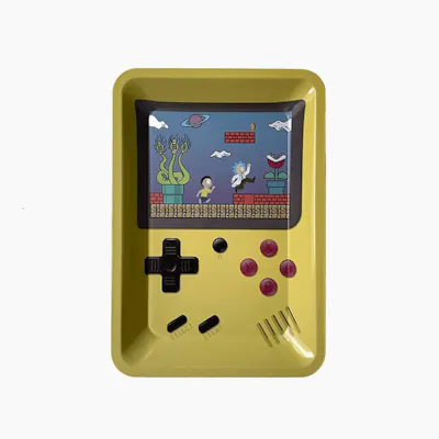 Metal rolling tray featuring a retro gaming console-inspired design with colorful pixel-style graphics and classic control elements. Crafted from durable metal with raised edges to prevent spills, it offers a smooth, easy-to-clean surface, making it ideal for organized and efficient rolling with a nostalgic, playful vibe.