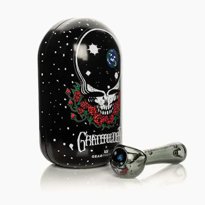 Grateful Dead collectible glass hand pipe set featuring a bold skull and rose design with space-inspired artwork on a matching protective case. Crafted from durable heat-resistant glass, the pipe includes a deep bowl and carb hole for controlled airflow, delivering smooth hits and a clean, flavorful smoking experience in a unique, artistic presentation.