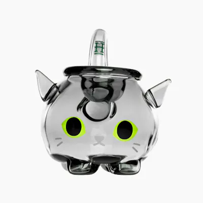 Novelty cat-shaped glass water pipe featuring a rounded body with bright accent eyes and playful ear details. Crafted from durable heat-resistant glass, it includes a built-in water chamber and downstem for enhanced filtration, delivering smoother, cooler hits in a fun, eye-catching design.