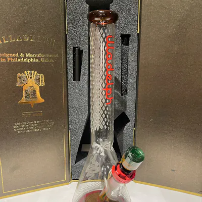 Premium glass cannabis bong in presentation box with beaker base and intricate design details High-quality cannabis water pipe featuring durable borosilicate glass and luxury packaging Beaker-style cannabis bong with angled downstem and removable bowl for smooth filtration Stylish cannabis bong with detailed artwork and stable wide base for consistent performance Durable glass water pipe for cannabis with efficient airflow and premium display appeal