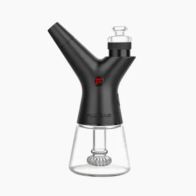 Pulsar cannabis vaporizer featuring a unique water-filtered design with a glass base and angled mouthpiece for enhanced airflow. This device is ideal for vaporizing dry herbs while providing smoother, cooler hits through built-in water filtration. A modern and functional accessory that combines innovative design, performance, and convenience for an elevated cannabis experience.