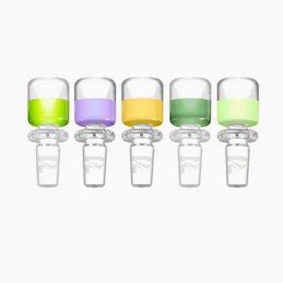 Set of premium glass cannabis bowls featuring a modern cylindrical design with assorted color bases, crafted from durable heat-resistant glass to provide smooth airflow, even burning, and a clean, flavorful smoking experience.