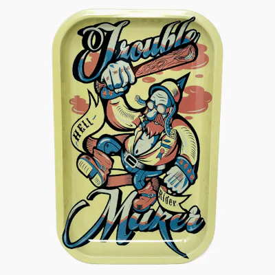 Trouble Maker cannabis rolling tray featuring bold tattoo-style artwork with a mischievous cartoon character and vintage-inspired lettering. This durable tray is perfect for rolling joints, organizing cannabis, and keeping smoking accessories neatly contained. A unique and edgy accessory that adds a rebellious, street-art vibe to any cannabis setup.
