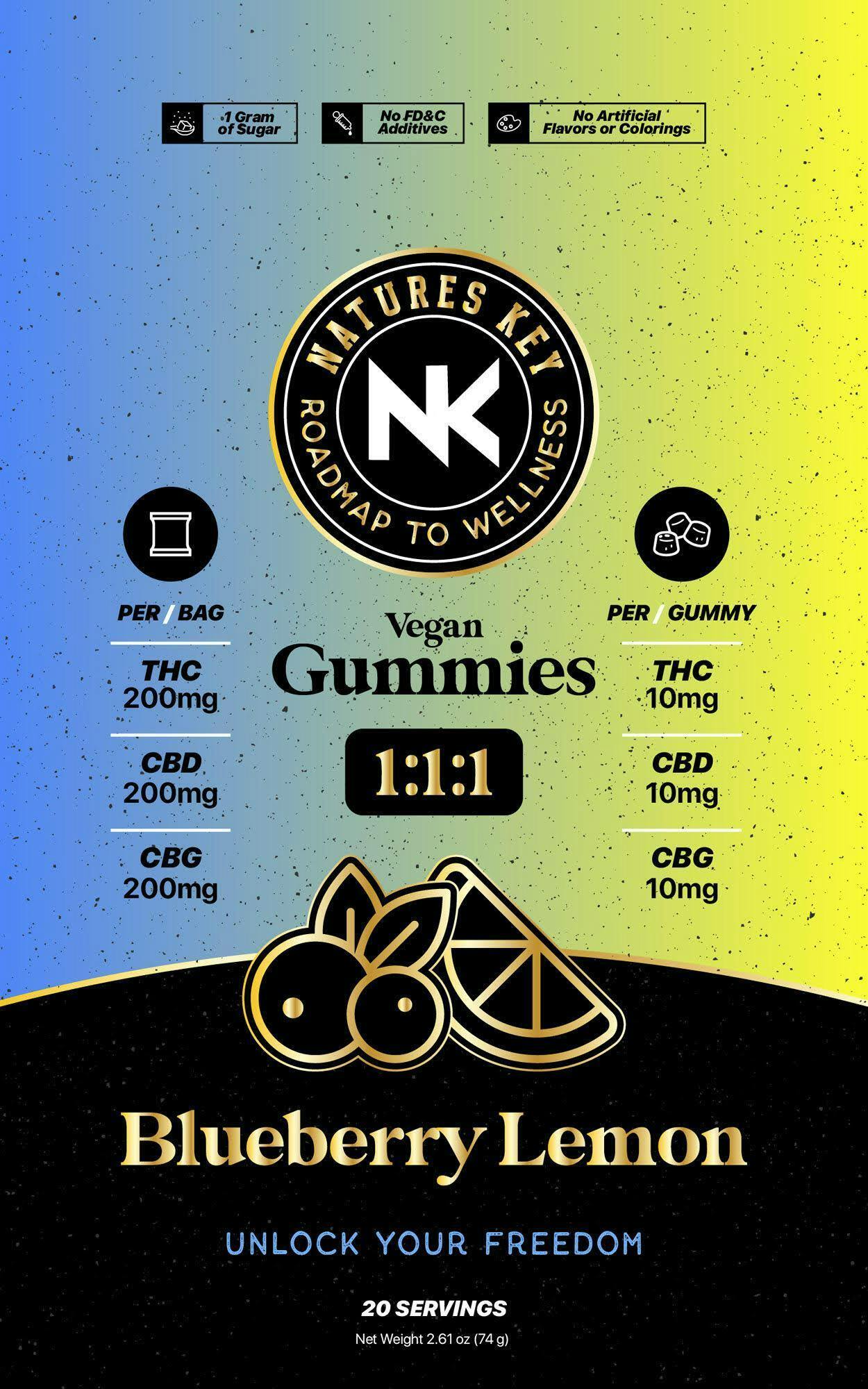 Natural Ingredients: Crafted with purity in mind, Nature's Key 1:1:1 Blueberry Lemonade Vegan gummies are made from premium cannabis extracts and natural flavorings, free from any artificial additives.