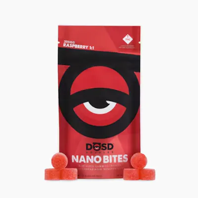 DŌSD Edibles NANO BITES provide more efficient absorption & a faster onset compared to traditional edibles. These delicious gummies are infused with our extensively refined, water-soluble cannabinoids, and utilize nano-molecular technology which translates to increased bioavailability. Get more out of your dose...with far less waiting. Flavor - Raspberry Ratio - 1:1 (100mg CBD:100mg THC, 10 pieces per package)