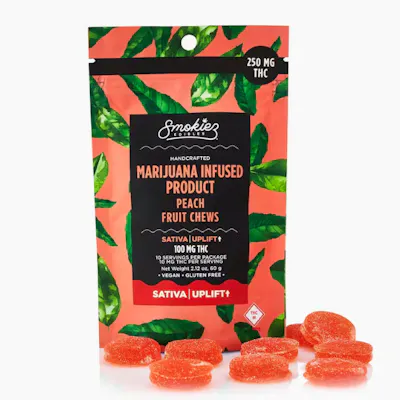 Now enhanced with real cannabis terpenes! Smokiez Terpene-Enhanced Sativa Peach Fruit Chews are NOT YOUR AVERAGE GUMMY™ These delicious Fruit Chews are a tasty and satisfying way for your customers to medicate! They are also Vegan, Gluten-Free, Dairy-Free, and contain NO High Fructose Corn Syrup. Each of our mouth-watering Fruit Chews contains 10 mg of THC, and are made with our high clarity cannabis distillate for great taste. There are 10 pieces per package with 250 mg active THC per package. Smokiez Fruit Chews come in 5 delicious flavors and have both sweet and sour flavor profiles that your customers are sure to love!