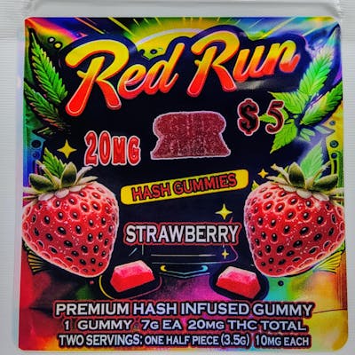 Introducing the Red Run Strawberry Hash Gummies, a perfect blend of succulent strawberry flavor and the serene effects of premium hash. These gummies are crafted to offer a sweet and satisfying escape with every bite, ideal for those who appreciate the finer pleasures in life. **Features:** - **THC Content:** Contains 20mg of THC per gummy, divided into two 10mg servings for easy and accurate dosing. - **Weight:** Each gummy weighs 7g, richly infused with the finest hash to ensure a uniform and potent experience. - **Flavor:** Authentic strawberry taste, expertly extracted from real strawberries to captivate your palate. **Benefits:** - **Delicious Flavor:**Indulge in the natural sweetness of strawberries, a classic favorite that enhances your relaxation with a delightful taste. - **Convenient Dosing:** Pre-sectioned servings simplify your consumption process, perfect for both new users and cannabis connoisseurs. - **High-Quality Ingredients:** Produced with top-tier components to deliver a premium cannabis experience. Red Run's commitment to excellence shines through with our Strawberry Hash Gummies. They not only promise a delightful gustatory experience but also embody the quality and reliability synonymous with Red Run. Relish in the lush, fruity flavor and smooth effects of our meticulously crafted gummies.
