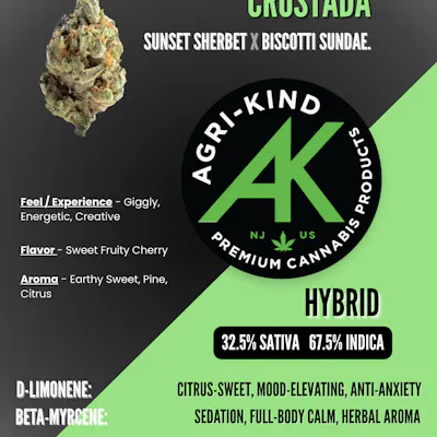 Crostada – 1g Flower by Agri-Kind Crostada is a flavorful hybrid that brings dessert-inspired sweetness and smooth, balanced effects. This strain features a rich terpene profile with notes of ripe berries, sweet pastry, and a touch of creamy earth, creating a fragrant and satisfying smoke. The effects typically begin with a gentle wave of euphoria that lifts the mood and settles the mind before easing into a calm, relaxing body feel. Crostada is a great choice for unwinding while still staying present and social, delivering a sweet, mellow experience from start to finish. 🌿🍓💨
