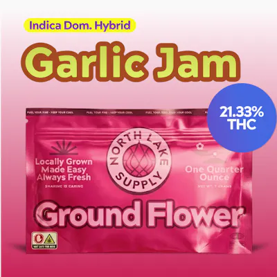 North Lake Supply’s Garlic Jam Ground Flower is a bold, ready-to-roll option that brings heavy flavor and convenience together in one no-prep package. This indica-leaning grind is packed with pungent notes of garlic, savory herbs, and a deep earthy backbone, finished with a subtle peppery kick that lingers on the exhale. It’s loud, funky, and full-bodied—perfect for anyone who loves that classic GMO-style profile. The effects settle in with a calming, full-body relaxation paired with a mellow, hazy headspace that helps take the edge off without completely knocking you out. Ideal for winding down, easing stress, or kicking back after a long day, Garlic Jam delivers a smooth, consistent burn and a flavorful experience whether you’re rolling up or packing a bowl.