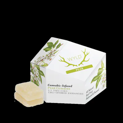 Wyld's Pear 1:1 THC:CBG gummies have been created with balance in mind. The restorative effects of CBG in combination with THC, alongside the terpenes found in Hybrid strains may provide greater rejuvenation than THC alone. This combination may be particularly useful when looking for balance. "100mg THC:100mg CBG per pkg 10mg THC:10mg CBG per gummy" "Ingredients: Sugar, Tapioca Syrup, Water, Pear Juice Concentrate, Gelatin, Coconut Oil, Natural Flavoring, Citric Acid, Malic Acid, Pectin (Pectin, Sodium Citrate), Cannabis Extract, Hemp Extract, Sunflower Lecithin Contains: Coconut" "Calories: 10 Total Carbs: 3g Total Sugars: 2g" Edibles are created either by infusing cooking oil or butter with cannabis extract, or by mixing extract directly into other ingredients. Because edibles are digested and absorbed by your stomach and liver, the activation is often longer than other consumption methods, taking on average 45 minutes, and sometimes up to 2 hours. It is important to start low and slow when consuming edibles so you don't over do it. Take extra caution to ensure edibles are out of the reach of children.