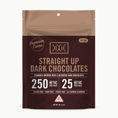 10mg per dose 100mg per package Bold, rich and decadent Dixie’s Straight Up Dark Chocolate gets right to the point — world class 70% cacao chocolate and pure, clean-extracted THC. Enjoy all the health benefits of 70% dark chocolate paired with the benefits of whole-plant cannabis. Treat yourself and taste-buds to a truly luscious chocolate experience.
