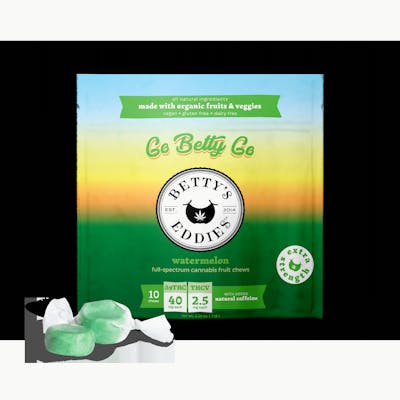 10 Chews 40mg THC 2.5mg THCV Betty’s knows best - put some pep in your step! Our Go Betty Go Watermelon chews are energetically infused with L-theanine, natural caffeine from coffee, and a blend of THC and THCV to help you go, go, go! Edibles are created either by infusing cooking oil or butter with cannabis extract or by mixing extract directly into other ingredients. Because edibles are digested and absorbed by your stomach and liver, the activation is often longer than other consumption methods, taking on average 45 minutes, and sometimes up to 2 hours. It is important to start low and slow when consuming edibles so you don’t overdo it. Take extra caution to ensure edibles are out of the reach of children.