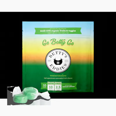 10 Chews 10mg THC 2.5mg THCV Betty’s knows best - put some pep in your step! Our Go Betty Go Watermelon chews are energetically infused with L-theanine, natural caffeine from coffee, and a blend of THC and THCV to help you go, go, go! Edibles are created either by infusing cooking oil or butter with cannabis extract or by mixing extract directly into other ingredients. Because edibles are digested and absorbed by your stomach and liver, the activation is often longer than other consumption methods, taking on average 45 minutes, and sometimes up to 2 hours. It is important to start low and slow when consuming edibles so you don’t overdo it. Take extra caution to ensure edibles are out of the reach of children.