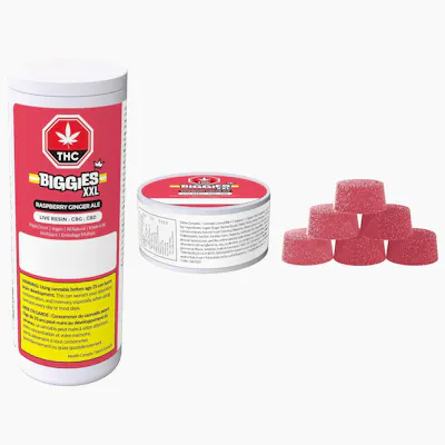 This multipack contains 6 immediate containers, each with one soft chew-for a total of 6 soft chews. Premium, rapid onset, LIVE RESIN, high quality BIGGIES. This multi-pack of 6 single gummies feature, THE BIG ONE'S, which are 8 gram oversized gummies with a total of 10mg THC (LIVE RESIN), 30mg CBG, 30mg CBD per individual gummy equaling a total of 60mg of THC, 180mg CBG and 180mg CBD per master container utilizing our Ice Cream Cake x Gelato #33 strain. This flavour profile features a refreshing, crisp and clean taste of ginger ale paired with a delicious twist of raspberry lemonade. Our gummies are manufactured in-house using Cannabis ingredients from British Columbia and are made with all natural ingredients are vegan, gluten-free, sulphite free and cannabis terpene enhanced.